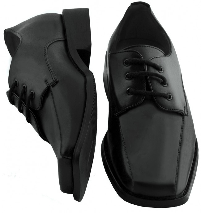 Boys black lace up Tuxedo Shoes with slim square toe. Why rent when you can buy the same shoes new for a few dollars more. All man made materials but a very comfortable shoe.