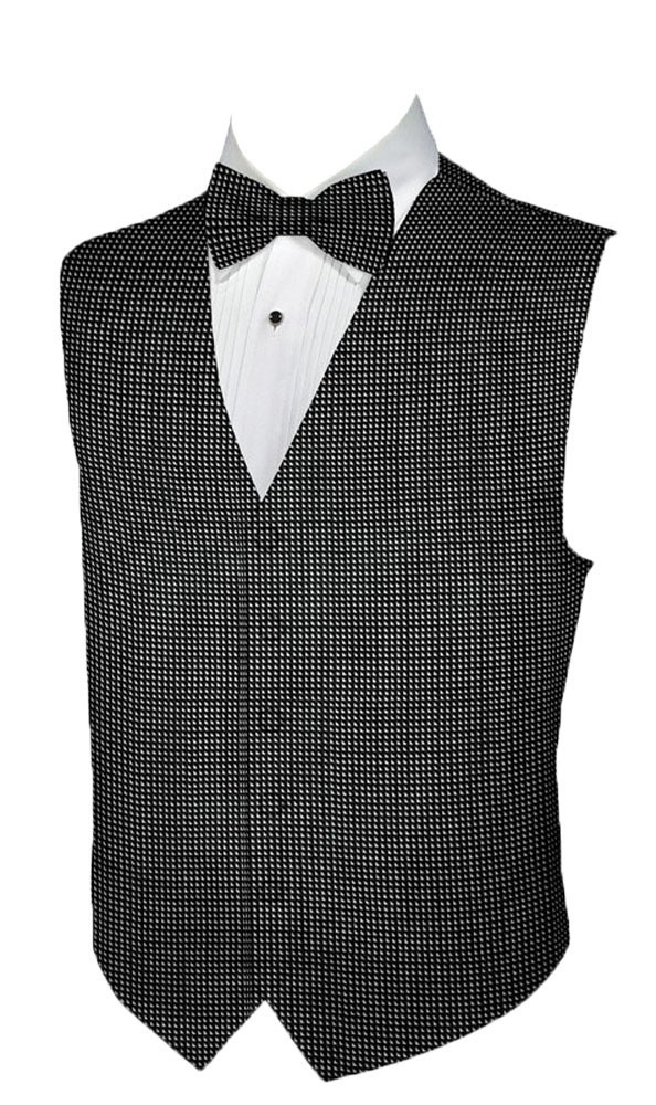 New TRYLUX CHARCOAL Tuxedo Vest and Matching Self Tie Bow Tie set. Five button, full back, adjustable waist with two real pockets. Full back, six button Vests with two real pockets. The lining and back are black. This vest is double basted and French faced, which means this vest will last you through thirty (30) dry cleanings. It should be dry cleaned but can be washed in cold water. Dont let the price fool you. This is a very high quality vest that retails for $85 or more in most stores. We are the direct importers of the product and can pass on the saving to you.
