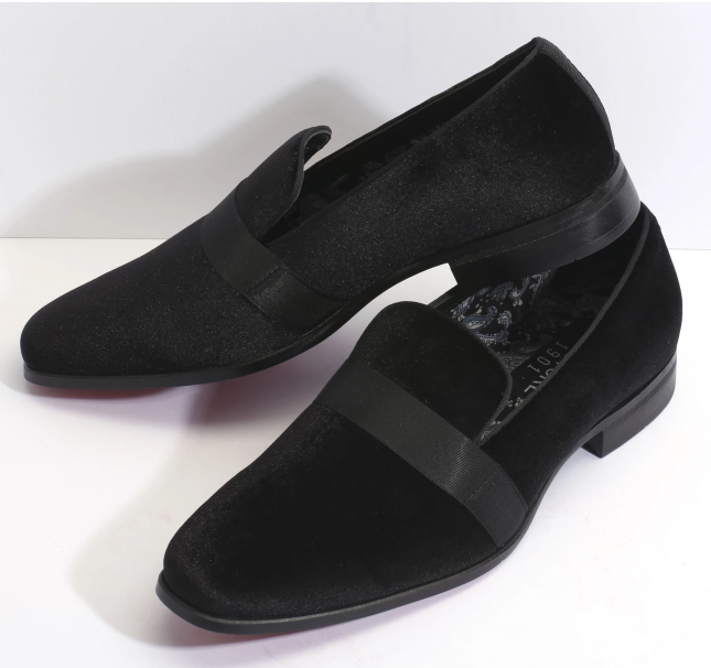 Velvet Black Slip on Dress Shoes with satin strap.The Lincoln Black Couture 1901 Tuxedo Shoe is a fashion-forward, memorable and modern take on a tuxedo shoe. Made of velvet, the Lincoln is a slip on shoe with a minor satin stripe detail for added style. Perfect for dinner dates, dance floors and those dressing to impress.Color: Black Material: Velvet Style: Slip On Fit & Sizes: 6 to 12 (Regular Width [D])