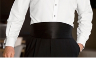 The advantages of a cummerbund and bow tie is that you can wear really nice studs and cuff links with them. Really nice cuff links don’t show a whole lot. You usually have to be dancing or move your arm up to show off your cuff links. Nice studs really dress up a tuxedo, and they will go into where the necktie goes. If you have nice studs or you want to buy studs and show them off, the thing to wear is a cummerbund and bow tie.