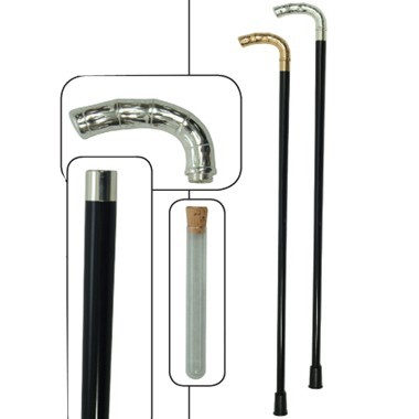 Cane with Liquor Bottle inside. GOLD finish Handle with a bamboo finished Walking Stick Shaft. The Handle screws off to reveal a liquor bottle. This Elegant solid maple wood walking stick measures 37 inches long with a rubber bottom tip. This formal cane is lightweight for ease of use. This formal cane is perfect for the distinguished gentleman who needs to carry with him liquid content. It can also be great for your prom or formal occasion where you can be the talk of the party with a formal cane with a stash. The classic styling of this formal walking stick will impress everyone who sees it. Add the look of sophisticated elegance to your wardrobe with this sleek yet comfortable walking cane, This walking cane is as comfortable as it is stunning. The handle is affixed to a sturdy maple wood shaft that features a sleek black finish that will retain its beauty for years to come. Whether you want to accentuate the look of your formalwear, or would just like a stylish, beautiful piece to add to your tuxedo for the next event you attend, these formal canes for men offer the classic styling you've been looking for at prices you can afford. These fancy mens canes are crafted of top-quality materials, so you can rest assured that your selection will last for years to come. Purchase yours today and add these distinguished looks to your collection! Due to the shape and size of a cane, and the high cost of freight we are only able to ship the product by standard UPS.