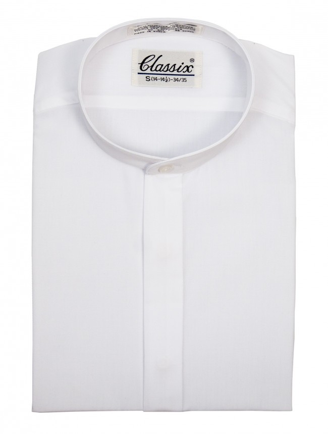 On Sale Banded Collar Dress Shirt in white made of 65/35 poly cotton fabric with front covered placket. Barrel cuffs that take cufflinks or can be buttoned. Has a top fused 1 wide banded collar. Look and feel your best at any event. Perfect for weddings, proms, or any other formal affair. Affordable, yet great quality that you will always find at TuxedosOnline.com. A fantastic high quality formal look for less than the cost of renting or that of large designer department stores. Specially made to withstand numerous washings and pressings.